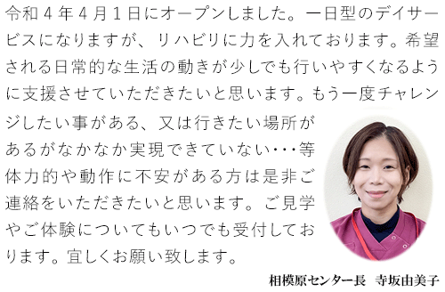 所在地 : 神奈川県相模原市中央区相生4丁目12-7 電話 : 042(707)1336 FAX : 042(707)1352 事業所番号 : 1472611332 サービス提供範囲 : 相模原市/町田市 サービス営業日 : 月曜日~土曜日・祝日 営業時間 : AM8:30~PM5:30